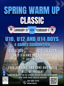 Third Coast Soccer Academy will be hosting a tournament on January 31 – February 1 in Rockport to help teams get ready for the upcoming Spring season. Entry is limited, so be sure and register your team as soon as you can.